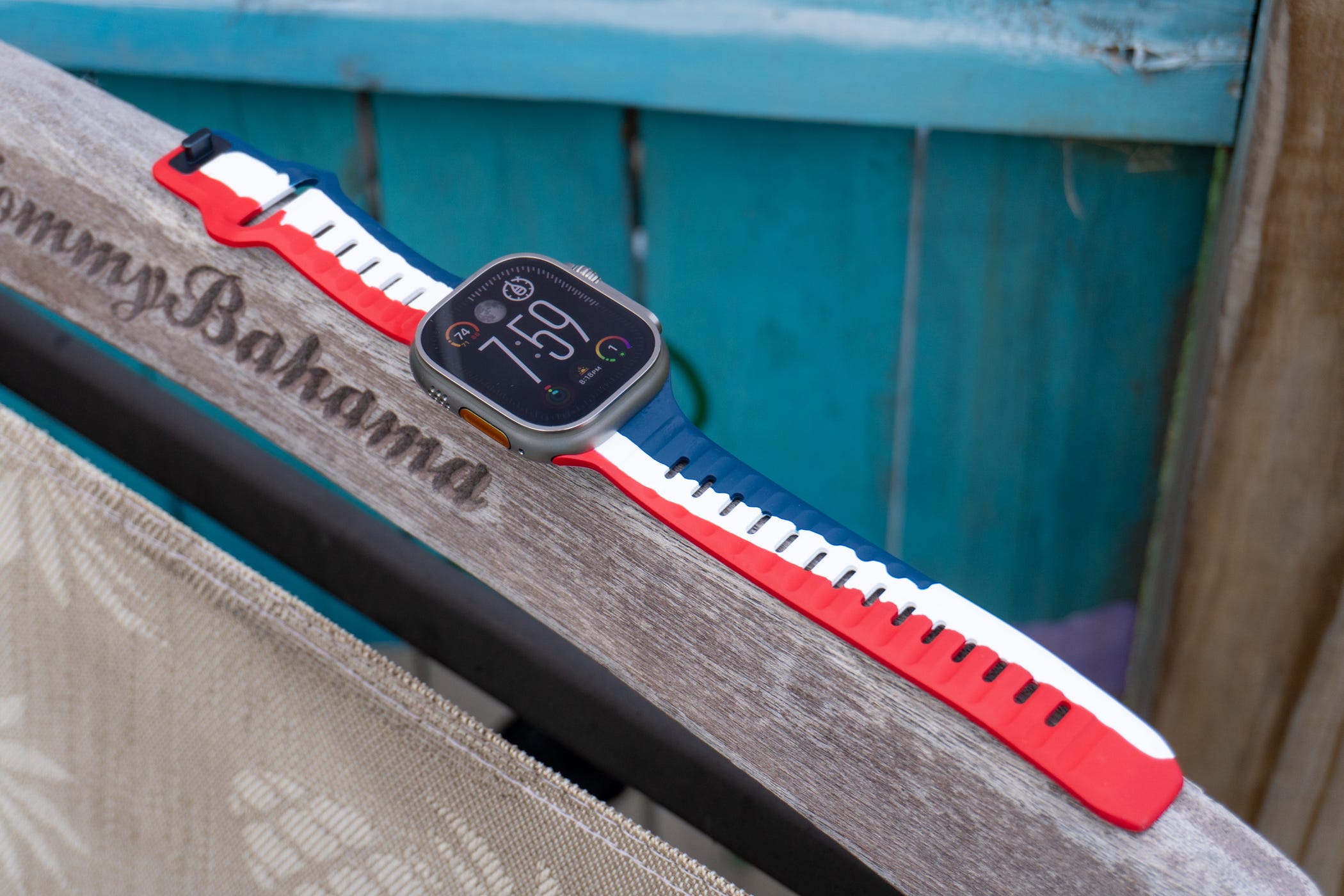 The new 2024 Summer Games Sport band boasts a classic patriotic paint job featuring red, white, and blue stripes to pay tribute to athletes worldwide. Nomad said in an email ahead of today’s launch that no two bands are the same thanks to the special ink injection process they use. I compared the sample they sent me to a friend’s and, sure enough, there were a few differences I could spot such as the direction of the ink and how much covered the white base.