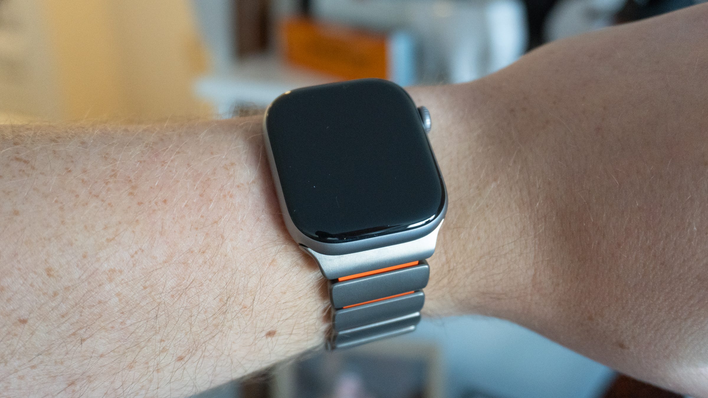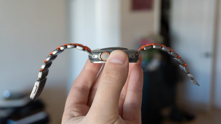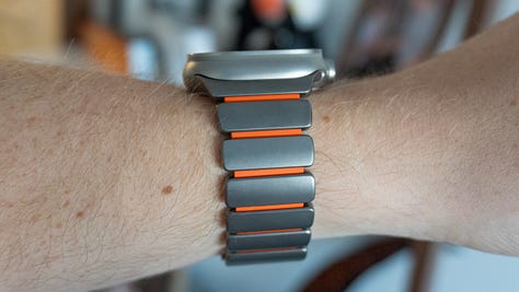 📐 Fit and finish. You can add and remove all the links you need to help the Stratos band fit your wrist. I had to take two links out and add a half-size link, which is included in the box. It’s an easy process removing links, too: the tool you need is in the box, and each pin is spring-loaded so you can snap them back together without needing to hammer them in, like with other link bracelets. The Stratos band is available in Silver or Carbide titanium to match your Apple Watch Ultra’s finish, and rubber options include Black, Volt, and Ultra Orange. I was sent two Silver bands with orange and black rubber, and they both look stunning. So far, my favorite is the Ultra Orange model.