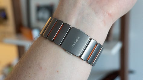 👀 Compared to Nomad’s other titanium band. The Stratos band is similar to Nomad’s Titanium band for the Apple Watch with its metal links and classic design, but takes a different approach in being more geared towards everyday comfort than traditional style. Both look great on the wrist, but the Stratos is the one you should get if you want something a bit more casual. The Titanium band is a great option if you want to dress up your Apple Watch before going out, but for other activities during the day, get the Stratos.