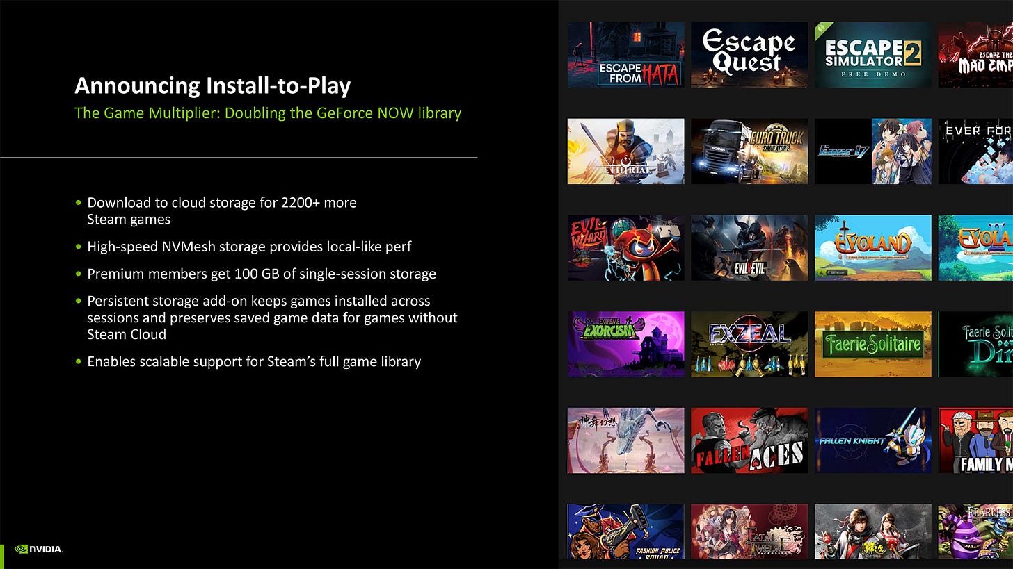 Install-to-Play allows users to install almost any game onto their virtual gaming PC on GeForce Now. Nvidia claims this increases the number of GeForce Now-supported games to over 2,200 more titles from Steam.