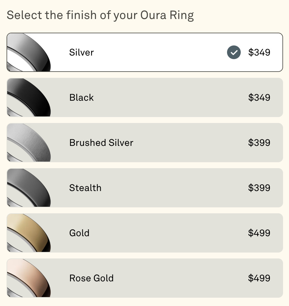 Additionally, while the standard Silver and Black Oura Ring 4 colors cost $349, you’ll pay more for the four other rings color choices. Brushed Silver and Stealth cost $50 more and Gold and Rose Gold cost $150 more. Here’s the official price list: