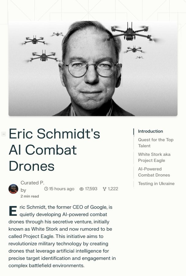 Forbes ran a hard-paywalled investigative story about former Google CEO Eric Schmidt’s AI Combat Drones by Sarah Emerson and Richard Nieva.
