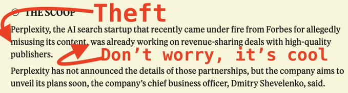 Even if reports are true that Perplexity AI plans a revenue share model in the future, as Semafor’s technology editor Reed Albergotti suggested (sounding like a Perplexity AI PR mouthpiece, selling out journalism for a scoop with that weak first sentence), why is it stealing content in the interim?