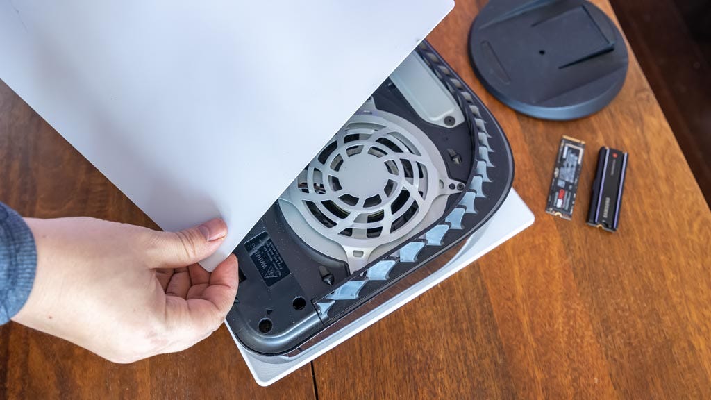 You’ll need to get inside your PS5 (don’t worry, this won’t void your warranty), which means removing the console from the stand and taking off the default white faceplate on the rear side (without the PlayStation logo).