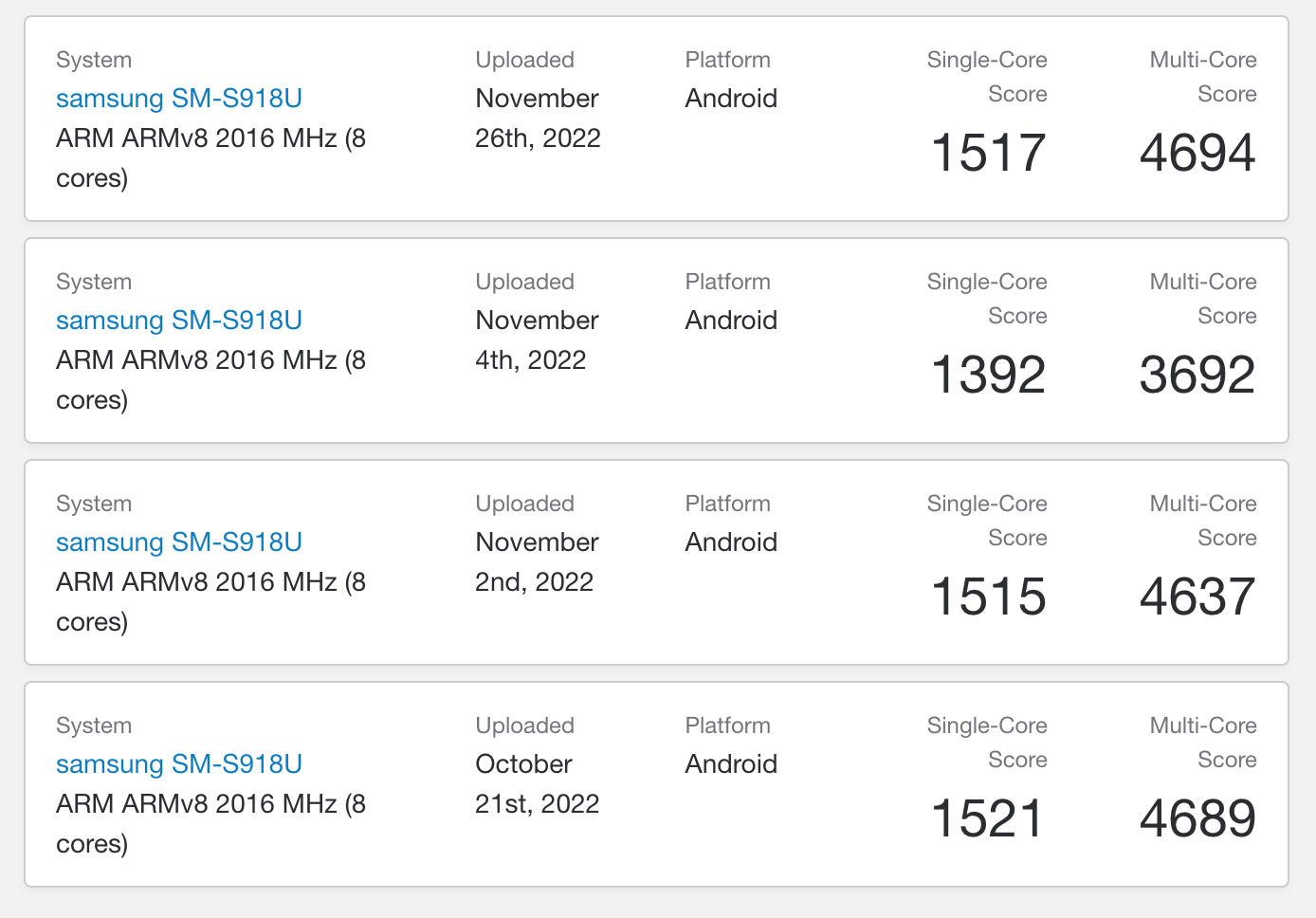 Both of those phones easily top 5,100 (some even approach 5,300) on Geekbench, the most popular CPU benchmarking tool, while scores for the same CPU at the heart of the Samsung Galaxy S23 just peaked at 5,000. In fact, many of the reported multi-core numbers hovered in the 4,600 range.