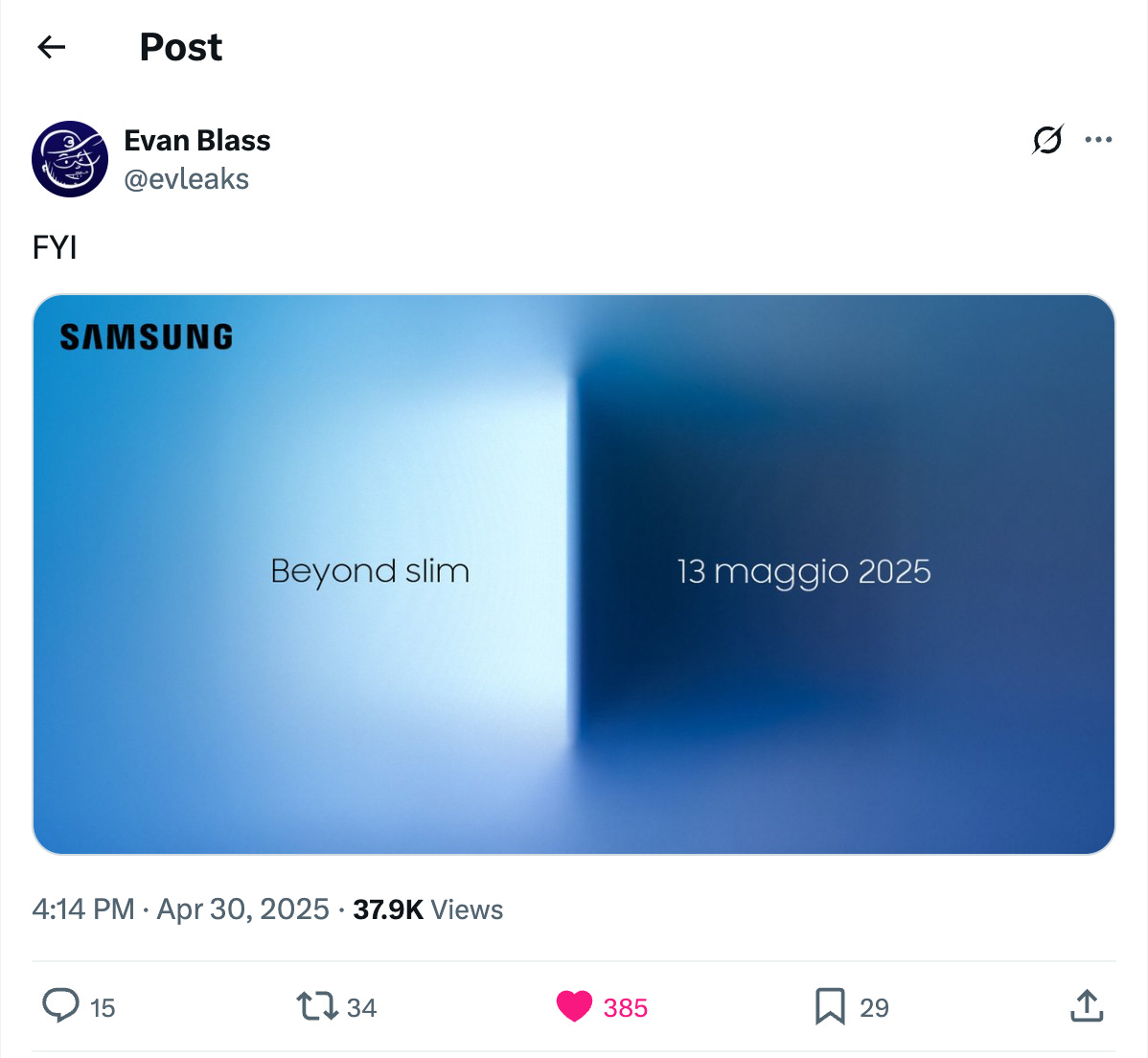 Samsung could formally introduce the Galaxy S25 Edge on May 13. Thatâs according to a leak posted by Evan Blass on X. In a since-removed teaser image, the caption âBeyond slimâ sat alongside the date of â13 maggio 2025,â which translates from Italian to May 13, 2025. We only expect Samsung to release one device this year that capitalizes on being slim, and thatâs the S25 Edge.
