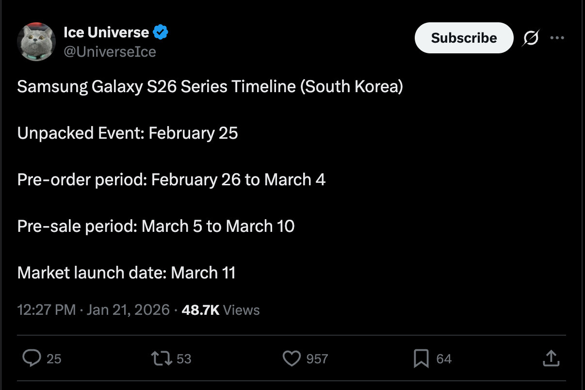 As per the leak, Samsung’s Galaxy Unpacked event for the S26 series will be on February 25, with the pre-order period of the phones running from that day until March 4.