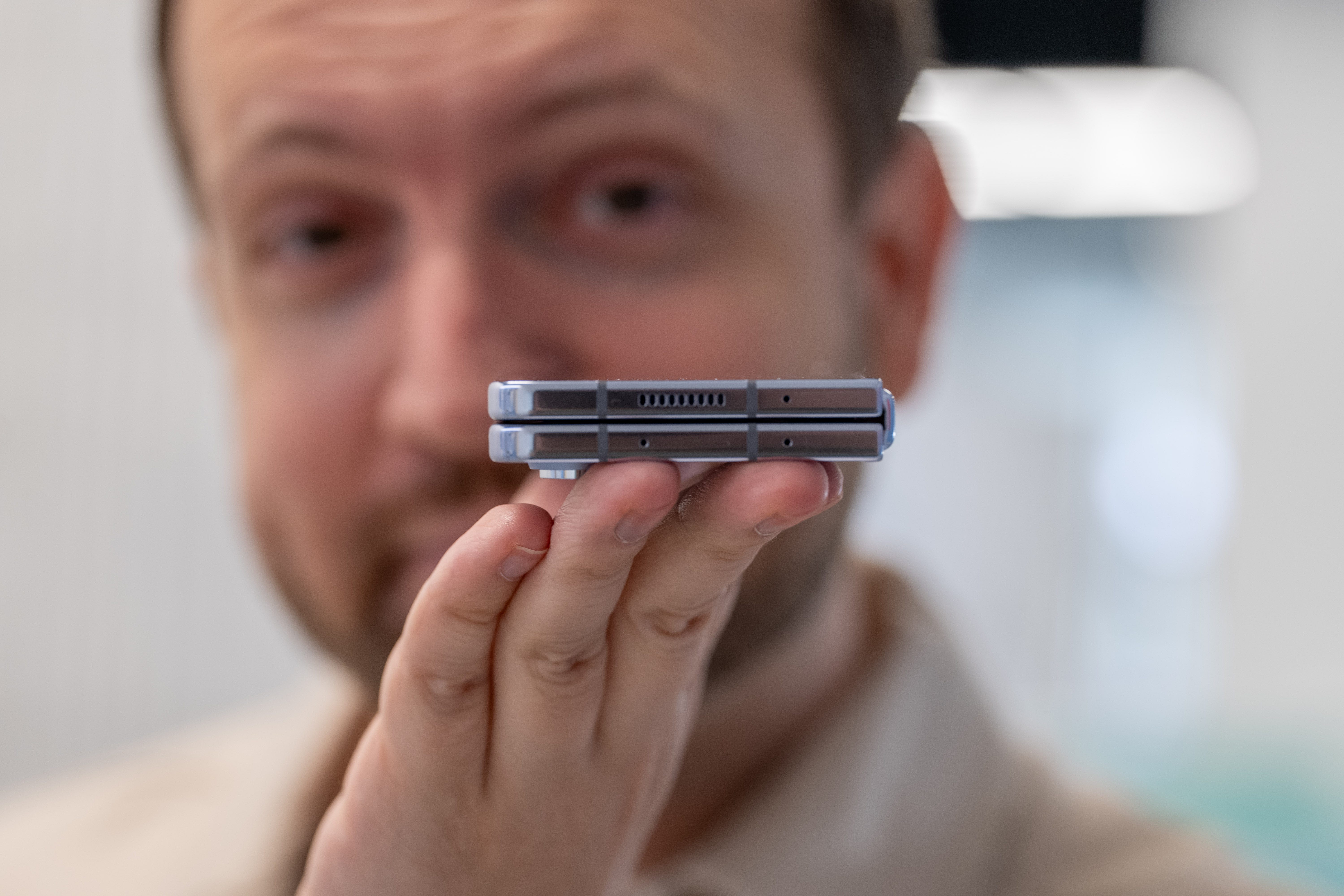 📐 Hinge is a match. It’s the right balance for what 2023 tech allows. You can see that the hinge is smaller for a tighter form factor. Yes, it’s still a meaty phone shaped like an oversized ice cream sandwich, but Samsung’s Z Fold 5 feels like things are headed in the right direction. Google launched the Pixel Fold as “the world’s thinnest foldable” (Google’s claim that still stands in the US), but it doesn’t feel as solid.
