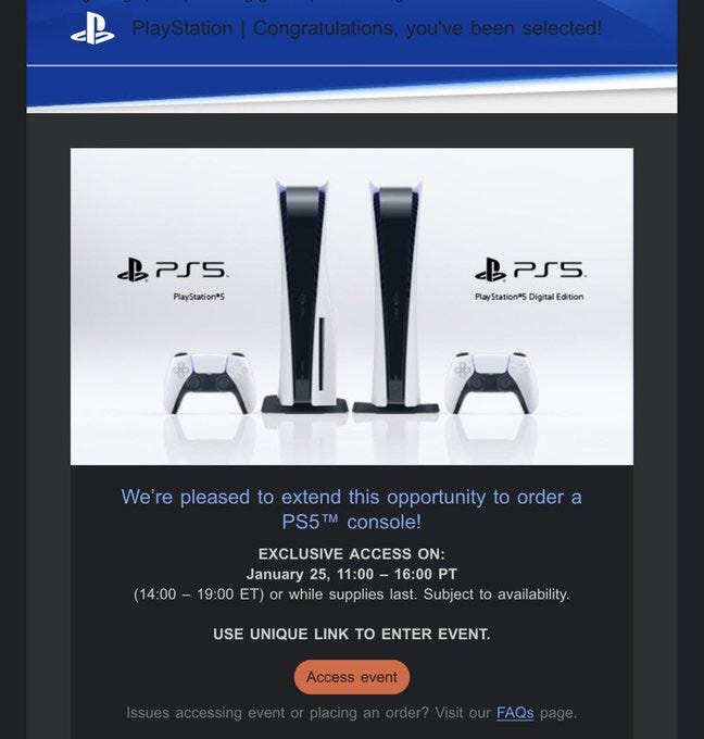 Final step: the Sony Direct PS5 invite will instruct you to click the “Access event” button in the email at 11am PT (which is 2pm ET) on a specific date. Usually, emails arrive in inboxes in the late afternoon the day before a PS5 restock, so you don’t have much time to notice that you got the Sony Direct email invite, unfortunately.