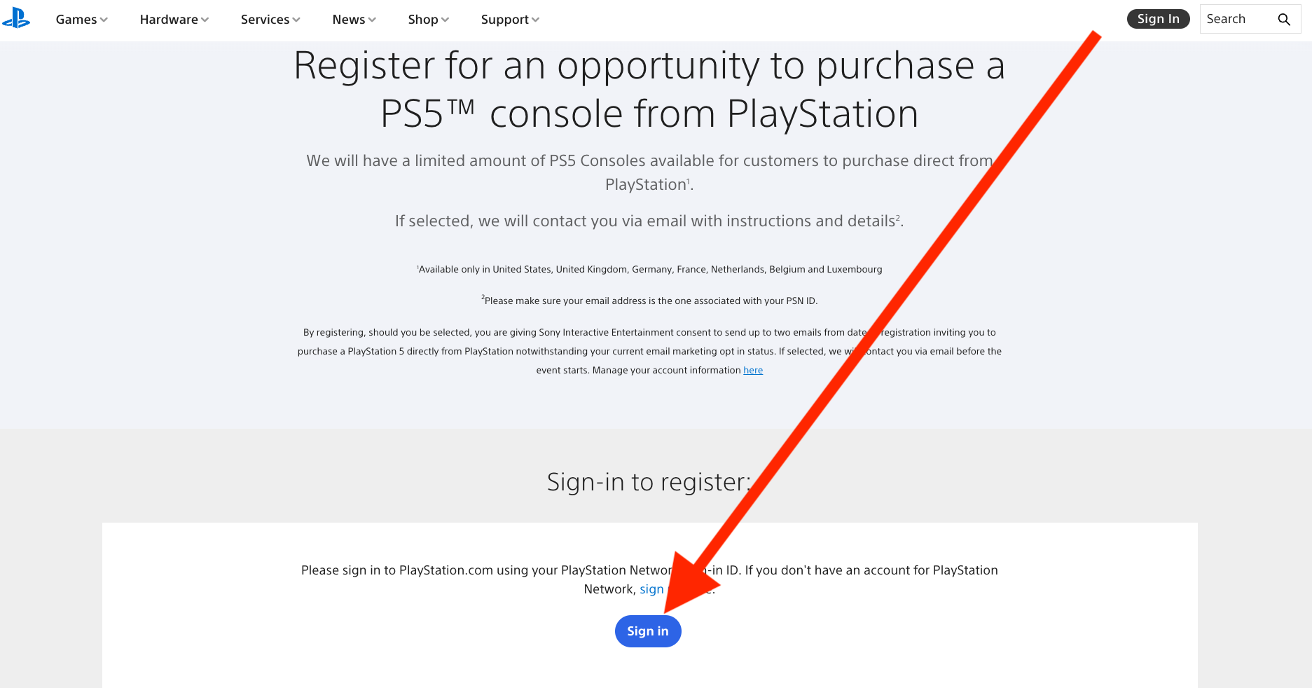 Logging into your PlayStation Network account is only half of the battle to registering for the next Sony Direct PS5 restock. The Sony website replaces the blue “Sign-in” button with a similar blue button that says “Sign up” in the same spot. Don’t forget to do that as it’s easy to overlook.