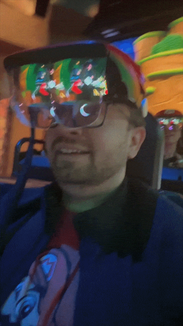🥽 I saw people forget to attach the AR glasses to the plastic Mario hat visor, and the glasses are essential for seeing the Mario Kart characters in augmented reality. The confusion is due to the fact that the tutorial is part of the main line. You’re given the red visor 2/3rds of the way through the line and the AR glasses are sitting on the ride’s dashboard. It’s up to you to magnetically clip them to the front of the visor. It’s a pretty disappointing ride without the AR.