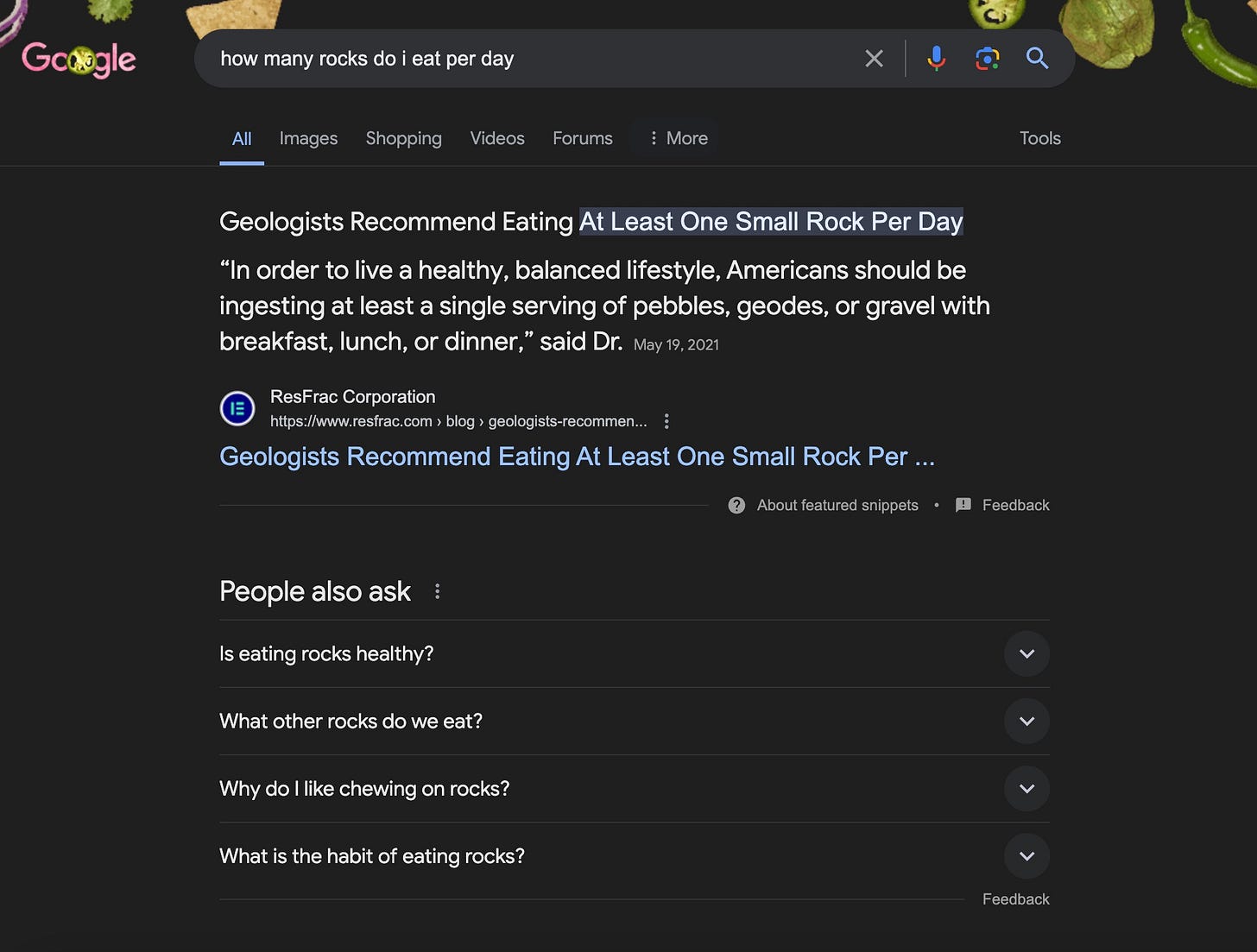 In another scenario I tested this week, Googleโs top answer suggests that eating rocks is part of a โhealthy, balanced lifestyle.โ In an earlier suggestion, the formerly reliable search companyโs AI Overview recommended drinking urine, but only โ2 litresโ of the โlight-colored urine.โ Google is really puts the die in diet. ๐คฆโโ๏ธ ๐คฆโโ๏ธ ๐คฆโโ๏ธ