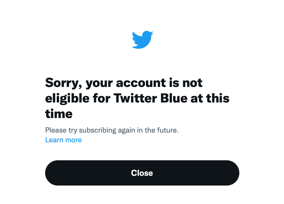 There are other reasons that might have you asking how to sign up for Twitter Blue. If you’ve just created a new account, for instance, you’ll have to wait. The subscription program is, for now, only available to accounts older than 90 days, one of the ways Twitter is trying to keep people from quickly creating impersonator accounts. You’ll also be flagged if your account hasn’t been active at any point in the last 30 days, which triggers the same 7-day waiting period as a name change.