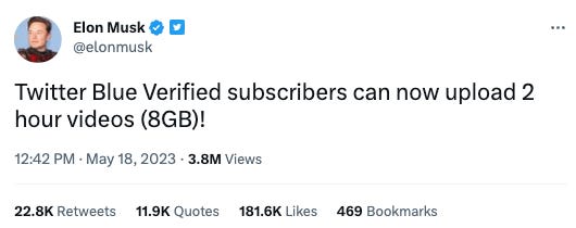 If you notice longer Twitter videos starting today, there’s a good reason: Elon Musk just announced that Twitter Blue subscribers can upload two-hour-long videos. That’s going to be a nice perk for current Twitter Blue subscribers, an incentive for non-subscribers to start paying and a big headache for copyright enforcement.