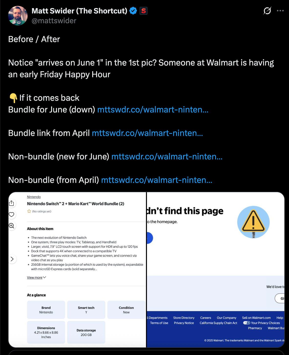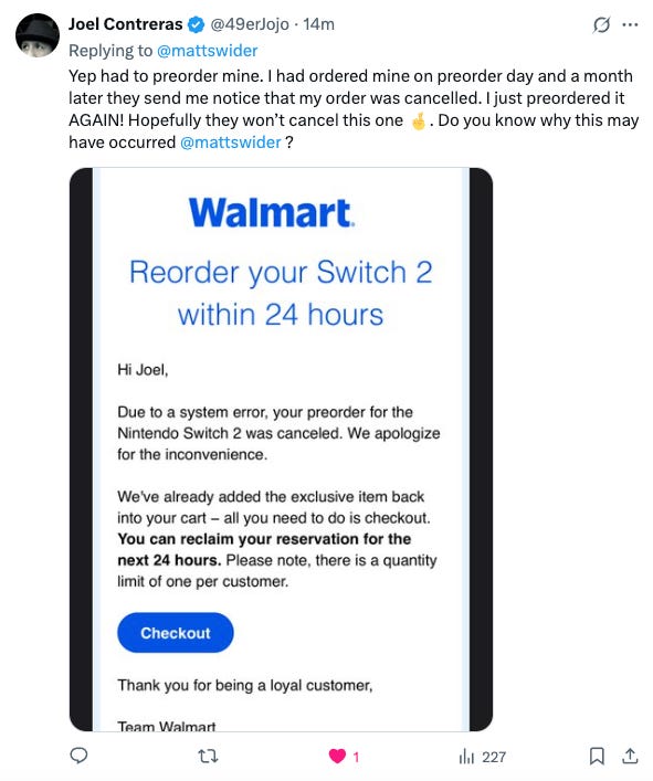 According to The Shortcut subscriber JF in our Substack Chat, his Switch 2 pre-order was cancelled, and after speaking to Walmart customer service several times, he was given one of these make-good links. JF indicated that the new order won’t arrive until June 8, three days after the official Switch 2 release date of June 5.